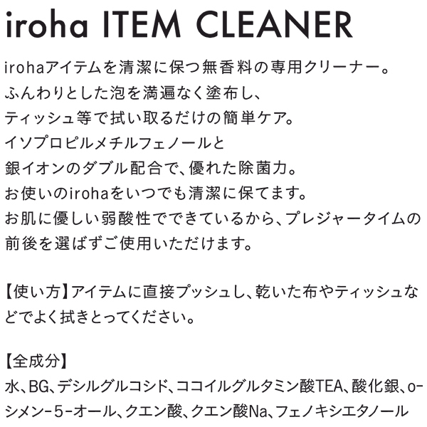 銀イオンとイソプロピルメチルフェノールのW配合で優れた除菌力を発揮!肌に優しい弱酸性仕様のiroha専用クリーナー50ml。 ワンプッシュで出てくるふんわり泡を万遍なく塗り、布やティッシュで拭き取るだけの簡単ケア♪ボトルはインテリアに馴染むお洒落デザイン。 |