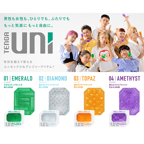 UNIsex&UNIversal。 男性も女性も、ひとりでもふたりでも。 性別やセクシャリティにとらわれず、誰でも楽しめる次世代プレジャーアイテム「TENGA UNI」。 もっと気軽にもっと自由に、プレジャーライフを楽しもう!TENGA UNIは、ぷるぷるのストレッチ素材で作られているので、指にはめて女性器にあてたり、ひっくり返して男性器を包んだり自由な使い方で楽しめます。 また、ひとりで楽しむだけでなくパートナーのために使うこともできるユニセックス&ユニバーサル設計のまったく新しいTENGAです。 UNI VARIETY PACK4種類のUNIがセットになったバラエティパック!それぞれ異なる刺激を楽しめます。 01 EMERALD [エメラルド]:大きなステップカットを越える刺激横向きに連なった大きなステップディテールによって、乗り越えるような刺激を楽しめます。 02 DIAMOND [ダイヤモンド]:細かなピラミッドカットが撫でる刺激均等に並んだ細かなピラミッドディテールによって、繊細に撫でるような刺激を楽しめます。 03 TOPAZ [トパーズ]:連なるラウンドカットの弾ける刺激全面に連なったラウンドディテールによって、転がり弾けるような刺激を楽しめます。 04 AMETHYST [アメジスト]:重なるスクエアカットに包まれる刺激大小が重なったスクエアディテールによって、包まれ吸い付かれる刺激を楽しめます。 |