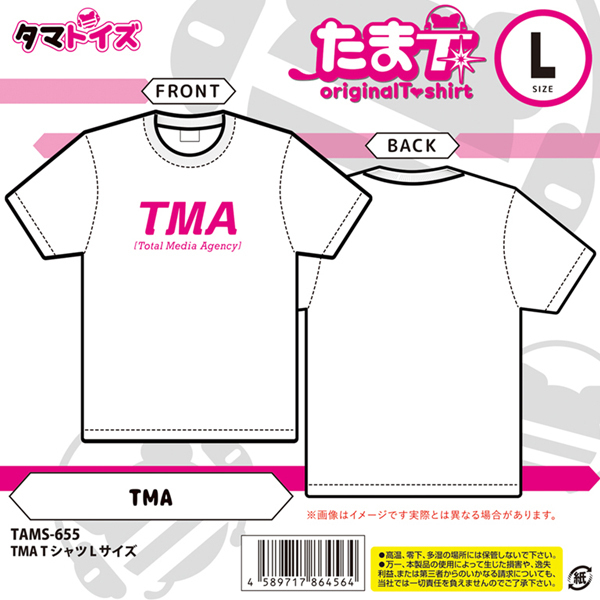 白地にピンクのテキストロゴがポップで可愛い半袖白Tシャツ。 胸元に「TMA」の文字をプリントしたタマトイズオリジナルグッズ♪パートナーとお揃いで着てみても◎ゆったりめのLサイズ●メーカー型番:TAMS-655 |