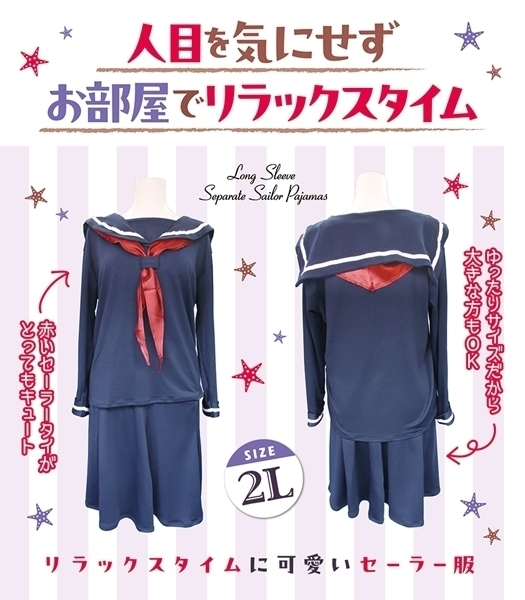 おとこの娘専用の可愛いセーラーパジャマが登場♪ゆったり2Lサイズで大きめの方でも安心!裏起毛のカットソー素材でふんわり暖かい着心地♪リアルなセーラー服みたいなセパレートタイプ!お部屋でリラックスタイムを可愛く演出♪赤いセーラータイがポイントのキュートなデザイン!胴回りもゆったり仕様でストレスなく着られます♪ポリエステル95%で肌触りも柔らかく快適!のんびり過ごすお家時間がもっと楽しくなりますよ♪●TAMS-1250 |