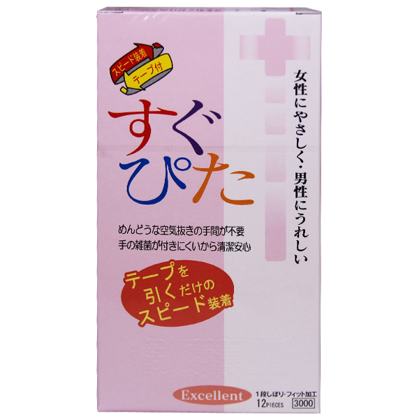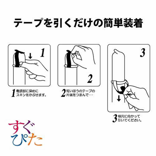 一度使ったらやめられない!テープを引くだけで簡単に装着できる、スピード装着テープ付きコンドーム「すぐぴた3000」12個入。 空気がうまく抜けなくて何度も装着してるうちに一個無駄にしてしまった、爪がうっかり当たって使用する前から破けてしまった、そんな経験はありませんか?「すぐぴた3000」なら、そんなお手間は取らせません。 特殊一段緊縮絞りが脱落防止に効く、ツブ突起付きコンドームです。 |