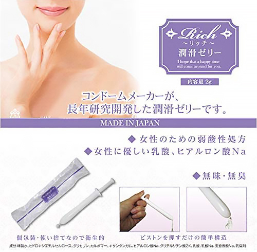コンドームメーカーが長年研究開発した潤滑ゼリーです。 潤い不足で悩む女性のために作った弱酸性処方で女性に優しい乳酸ヒアルロン酸Na。 ●急性毒性試験済みなので安心してお使いいただけます●無色透明・無味無臭の潤滑ゼリー●注射器型だからワンタッチで手を汚さず衛生的●ピストンを押すだけの簡単構造●個包装・使い捨てなので衛生的。 30本入り |