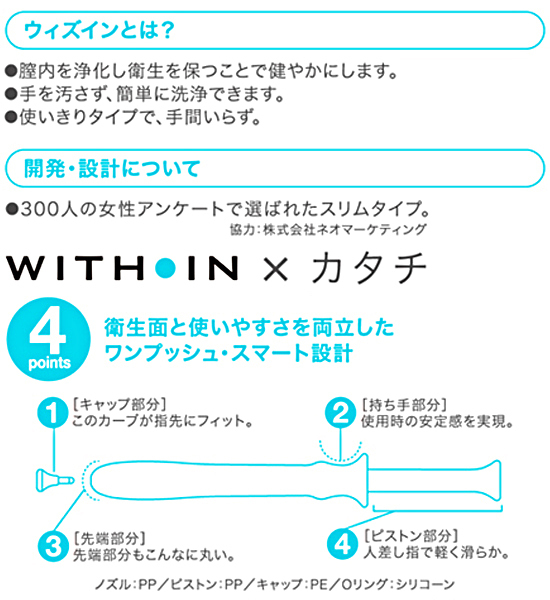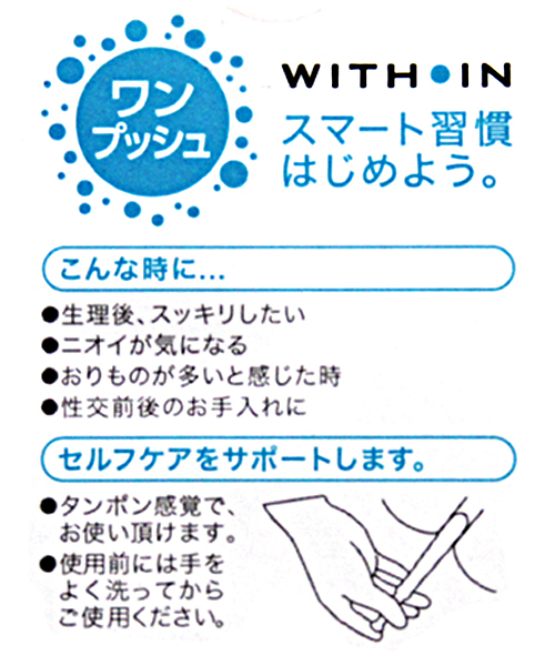 性交前後や生理中、オリモノが多い時に◎デリケートゾーンを内側から綺麗にお手入れできるクサノハ化粧品の日本製膣洗浄器(管理医療機器)。 挿入しやすいスリムタイプで、衛生的な一回使い切りタイプ♪膣内に挿入してワンプッシュすれば手を汚さず簡単に洗浄できる!使い心地はとってもナチュラルで、初めての方でも安心してお使いいただけます。 無色透明&無味無臭 |