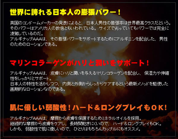 男性用マッサージローション「アルギナップAAA (ノーマル)」マリンコラーゲンも配合した弱酸性なので、肌への負担も少ないです。 |