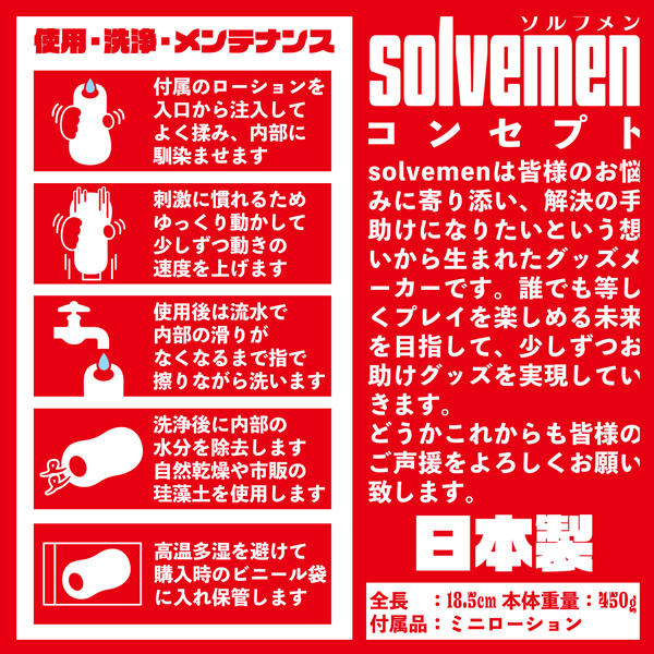 様々な人の悩みをなんとか解決したいというコンセプトをもとに生まれた「ソルブメン」より、すっぽり包み5つの縦ヒダで弾くように刺激する♪全長18.5cm、重さ450gのビッグな日本製の非貫通オナホが登場。 ヒダ突起に螺旋に渦巻くスパイラル構造をプラス、快感を後押しする内部に設計!ほかにもショートサイズもご用意しております。 繰り返し使用可能 |