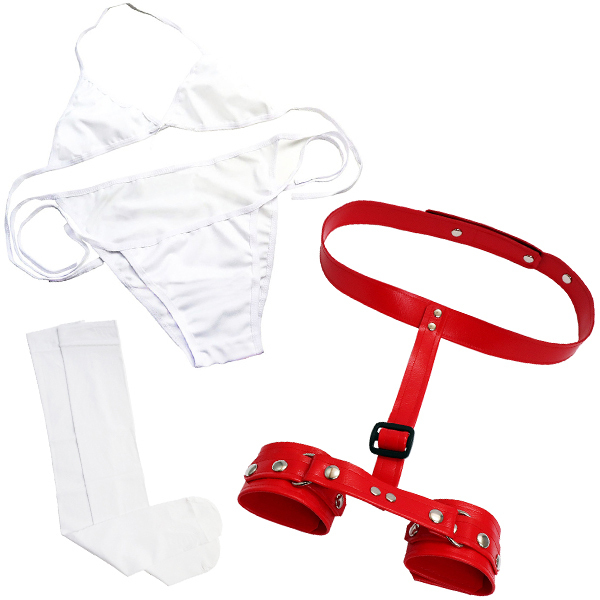 | ■仕様:パッケージ:30.0×19.8×5.0cm 本体:フリーサイズ セット内容:枷、ブラ、ショーツ、ニーハイ 重量:189g |