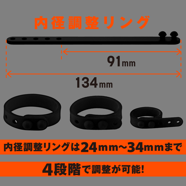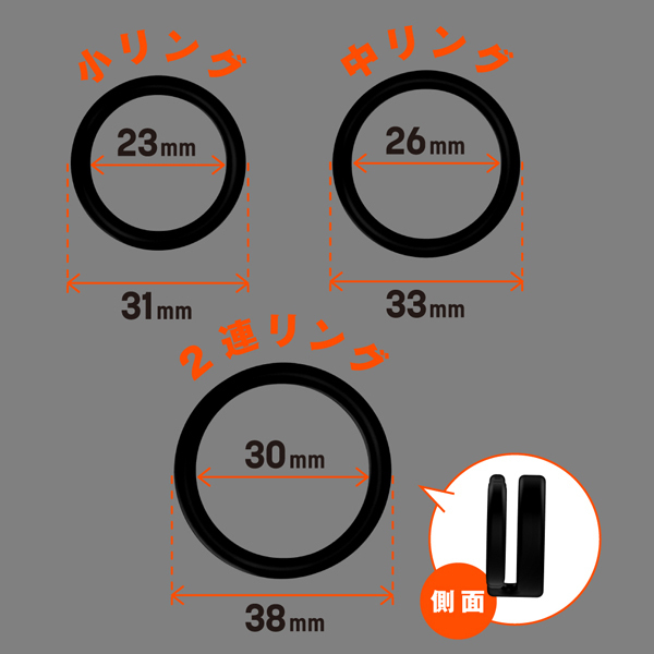 しっかり固定して外れにくい!高品質シリコンの弾力性に優れたペニスリング。 ベタつきのないサラスベ質感で着け心地抜群!一つだけ使うも良し同時装着もOK♪皮戻り防止や持続力アップなどシチュエーションに合わせてお使いください。 内径23mmの小サイズ、26mmの中サイズ、30mmの2連リング、そして自分の身体に合わせてサイズ変更できる内径調整リングの4個付属。 |