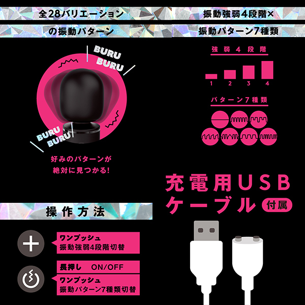 コンパクトなボディで女性でも持ちやすい♪絶対にイケる王道デンマ「完全防水 超愛振動 DENMA 28 black」です。 押し当てても痛みが少ない柔らかなソフトシリコン素材を使用♪全28パターンの多彩な振動バリエーションで優しい刺激から壊れちゃう刺激まで全部楽しめます。 ふんわりサラサラで優しい肌触りにIPX7等級の完全防水仕様!使った後のお手入れもラクチンです♪振動パターンは7パターン振動&4段階強弱で50db。 充電用USBケーブル付属。 |