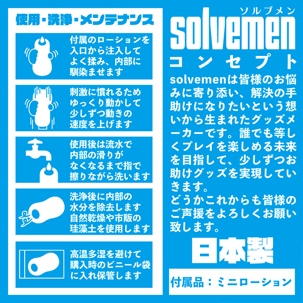 開放感がありマッタリとしたロングな快感が味わえる非貫通型オナホ「とにかくひろい」。 普段からゆったりとした余裕のある内部構造を待ち望んでいた方にとっての嬉しい仕様♪柔らかめの素材で無理なく長時間楽しめるように工夫されていて、ねじれヒダと内部の広さ、焦らしが織りなすソルブメンのコンセプト型ホールなら毎日楽しみながら新しい扉を開く事ができる事でしょう。 素材は安心安全の日本製!繰り返し何度でもご使用頂けます♪ |