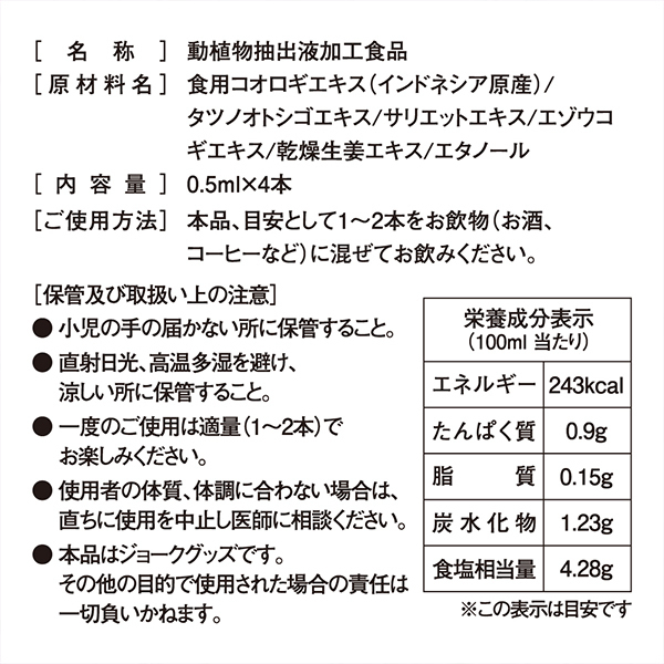 【悪用厳禁】ですよ!人気の女性向けリキッド「濡れアワビ」シリーズに新商品が登場♪お酒やジュースに混ぜて飲もう!スッキリとした味わいでドリンクに混ぜたことも忘れるほどの飲みやすさ♪「原材料名」食用コオロギエキス、タツノオトシゴエキス、サリエットエキス、エゾウコギエキス、乾燥生姜エキス、エタノール。 「内容量」0.5ml×4本。 「ご使用方法」本品、目安として1〜2本をお飲物(お酒、コーヒーなど)に混ぜてお飲みください。 |