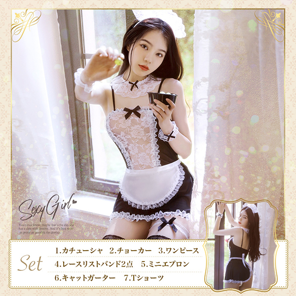 | ■仕様:フリーサイズ セット内容:カチューシャ、チョーカー、ワンピース、レースリストバンド×2、ミニエプロン、キャットガーター、Tバックショーツ |