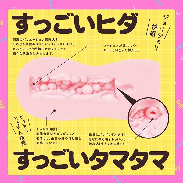 ジョリジョリ刺激と猛烈なヒダによる快感!とぅるんとぅるんのすごい快感♪正反対の2つの刺激が奇跡のコラボレーションを遂げた非貫通オナホ「極たまヒダばーじん」です!摩擦ZEROのなめらか極玉密集地帯を縦横無尽にうねり走る極太の肉ヒダが凄まじい♪ぷにゅぷにゅと蕩けながら遅い狂うようなジョリジョリ刺激!これはまさに未体験の絶対快感♪ピストンしたり回転させたりすることで刺激のバリエーションが無限大に広がります!覚醒型素材「GROW UP SKIN」を採用し、使えば使うほどにあなたに馴染んで成長する人肌感覚の高弾力素材が心地良い♪直接肌に触れるものだから安心の国産素材を使用!パッケージイラストは人気絵師すーぱーぞんび氏を起用。 ベタツキなしでニオイなし!相反するツンデレ快感をぜひお試し下さい。 |