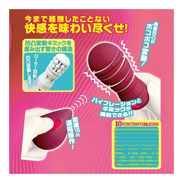 ただ震えるだけじゃない!特殊な機巧アクションが遠隔操作で楽しめる、新しいワイヤレスローター「リモコンギミック」!ワインレッドカラーの「ローラー」は、表面の凹凸が変動するローラーギミックを搭載!小さなボディながらも、内蔵ローラーが回転するアクションで、表面凹凸がポコポコと変動します。 電動バイブのパール刺激がもつあの気持ちよさ、モバイルで楽しめます!さらに、ギミック部分だけではなく、リモコン部分も最先端!遠隔操作の距離は15mまでOK。 操作もシンプルな2ボタン式。 動作ファンクションは10アクションパターン。 本体部分には触り心地の良いシリコン素材。 本体はUSB充電&リモコンは単四電池と、入手しやすさも抜群。 さらには、本体だけでも動作できるスグレモノ!まさに新時代リモコンローターのフラグシップマシン!新感覚のリモコンプレイを堪能しましょう! |