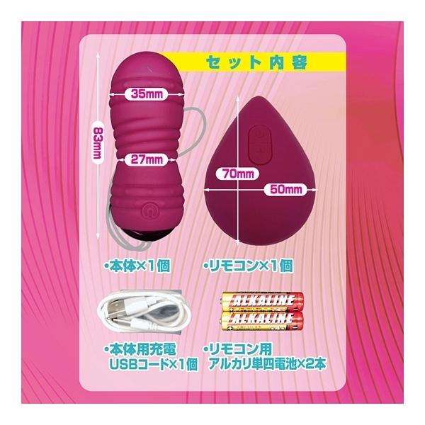 | ■仕様:パッケージ:17.8×10.7×4.0cm 本体:8.3×3.5cm 重量:68g 電池:ローター(USB充電式)、リモコン(単四電池×2本使用) |