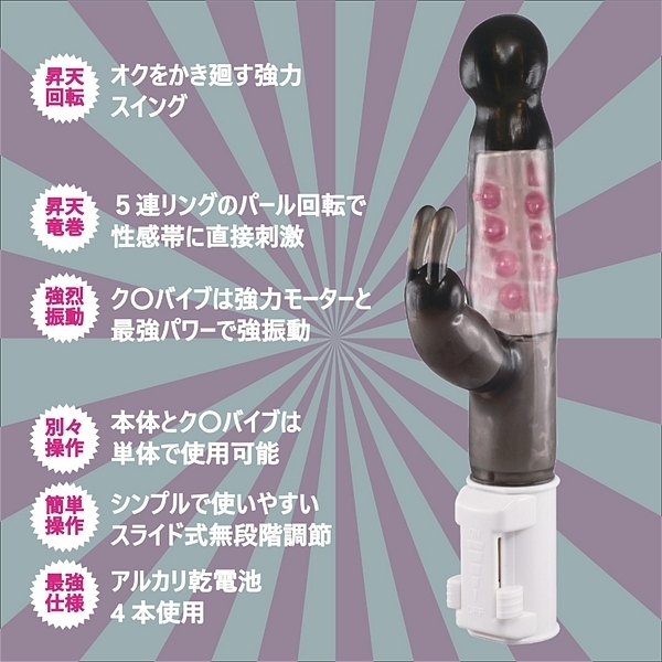5連パールのトルネード回転と超爆振ク〇バイブで一気に昇天。 挿入部はモチモチ素材を採用し、従来のザ・バイブのカタチから少し変えて丸みを帯びた形状へ変更。 スムーズな挿入と局部内を優しく圧迫します。 丸いのでGス〇ットへのアプローチもスムーズで奥イキ派のニーズにもしっかり答えてくれます。 大粒5連パールリングは局部内でトルネードのようにグリグリ回転。 ポ〇チオをグリングリン刺激し一気に火照りMAX。 ク〇バイブはかなり強力なので要注意。 このク〇バイブだけでも十分に愉しめるのに、Gス〇ット・ポ〇チオ、ク〇トリスの3点攻めで大満足。 潮ふき昇天すること間違いなし!本体とク〇バイブは別のコントローラーなので使い勝手のきく仕様。 自分好みに育てて下さい。 ●カラー:ピンク |