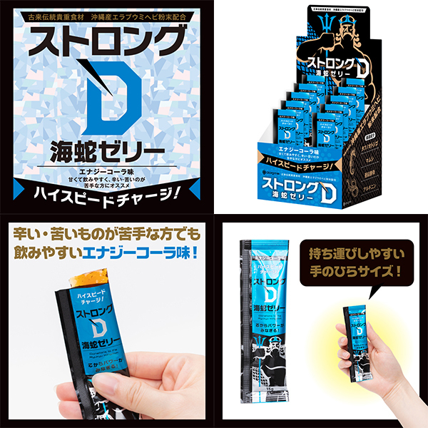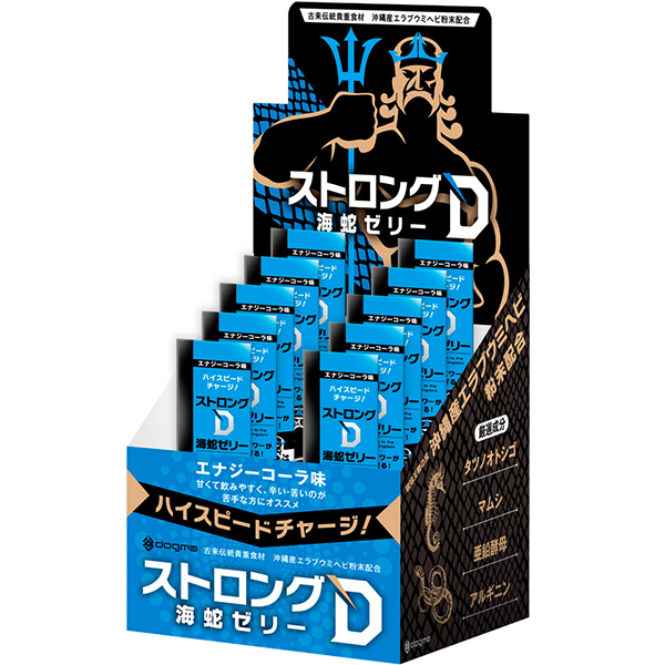ハイスピードチャージで芯からパワーがみなぎる!琉球地方古来より、伝統的高級食材として珍重されたエラブウミヘビの圧倒的な滋養力を基に開発された、大人気「ストロングD海蛇」シリーズからゼリーverが登場!アミノ酸42種類・ビタミン・ミネラルが豊富なウミヘビ成分&相性の良い厳選成分に「マムシ抽出液、タツノオトシゴ抽出粉末、亜鉛含有酵母エキス、アルギニン」を贅沢に組み合わせて配合。 いきり立ちたい夜の即戦力にぜひ!ツルンと口の中を滑っていく飲みやすい食感です。 エナジーコーラ味で甘味が強めなので辛い・苦いのが苦手な方にオススメです。 10個綴り |