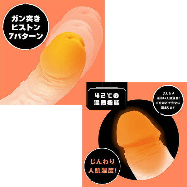 超絶リアル造型で本物セックスを楽しめるピストンバイブが登場!温熱機能は人肌より高めの42℃設定にすることで、興奮したアソコの熱感を再現!日本人男性の平均的なサイズ感なので、かなり本物に近いプレイが楽しめます!振動付きなので快感倍増!ぷにっと柔らかなソフトシリコン仕様です。 ピストン・振動7パターン&生活防水&充電用USBケーブル付属。 |