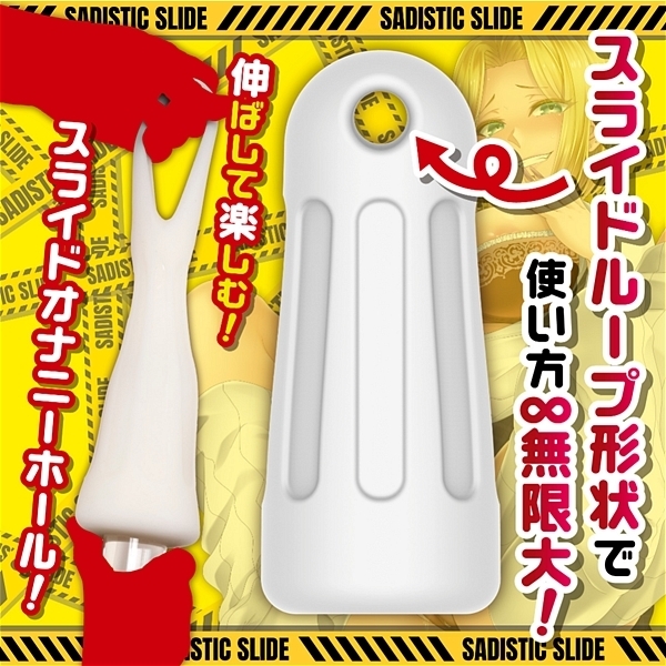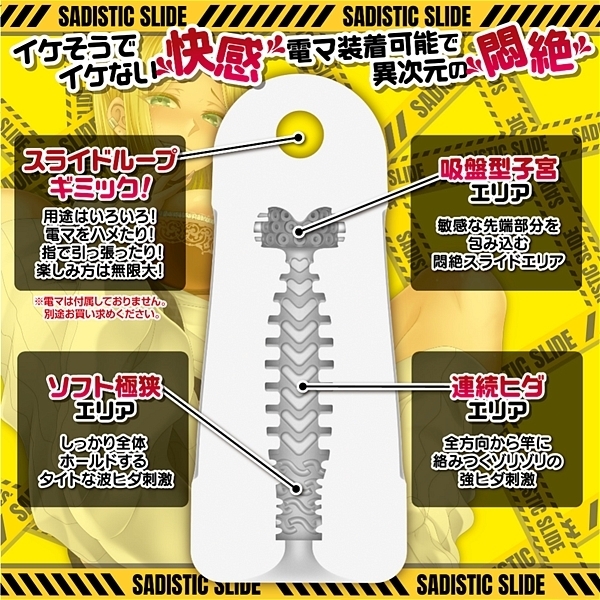 先端を刺激するギミックホール「サディスラD」は伸ばして楽しむスライドオナニーが楽しめるオナホールです。 電マやローターを装着できるオナホールが欲しい!オナホールを伸ばして刺激したい。 という新しい想像から「サディスラD」は開発されました。 上部に空いている「スライドループギミック」は電マやローターをハメたり、引っ張ったり、握ったり、ねじったりと、いろいろな楽しみ方で遊べます。 「電マ」「大型ローター」を装着することにより、他では味わえない「先端を直撃する強力な振動」で「イケそうでイケない状態」【悶絶】を味わえます。 根本をおさえて伸ばして楽しむ「スライドオナニー」やねじって楽しむ「スクリューオナニー」などオナホール本体の「形状変化」に取り組んだ「新しいスライドオナニー」をお楽しみください。 非貫通オナホール、ソフト素材使用。 保管に便利なブリスターケース付き、専用ローション付き。 ※電マ、ローター等は付属しておりません、別途お買い求めください。 |