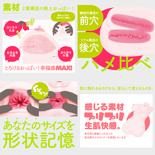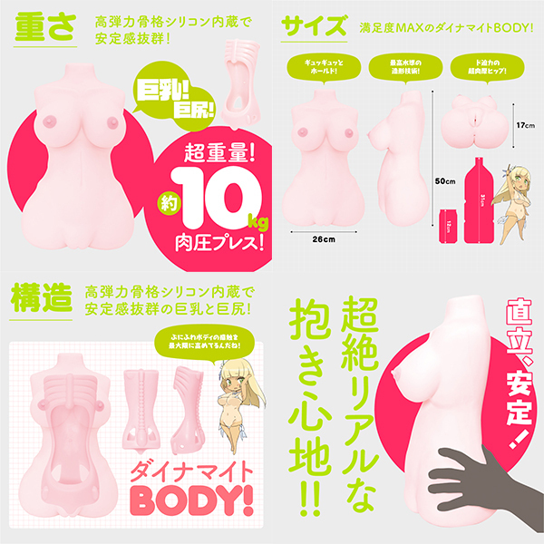 超重量約10kgダイナマイトボディ!高弾力骨格シリコン内蔵で安定感抜群の巨乳と巨尻!リアルな抱き心地を完全再現しました!とろとろ内層×ぷりぷり外層の2層構造で揉み心地にもこだわった極上おっぱいは耐久性抜群!夢のパイズリに幸福感MAX!ずっといじっていたくなる少し硬めの素材で成型されたコリコリ乳首は触りすぎ注意!?ゾリゾリ6連巨大ヒダの前穴とキツキツうごめく巨大イボの後ろ穴を贅沢ハメ比べ! |
