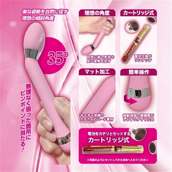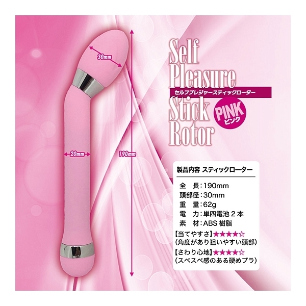 この角度が凄い!セルフプレジャーにピッタリ!おじぎをするように頭部が曲がったタイプのスティックトイが新登場!全長19センチのセルフプレジャー向けのスティックローター。 傾斜度35度、狙った箇所に当てやすいように頭部の角度を曲げました。 この傾斜度が、無理な体勢を強いらずに、自然に楽で気持ち良い姿勢へ促すことでしょう!さらに、振動を強弱調整しやすいダイヤル式コントローラー。 電池をセットしやすい、カートリッジ式。 使いやすいサイズとなる、全長19センチに、頭部直径3cm。 握りやすい、スティック部直径2センチ。 軽くて持ちやすい、重さ62グラム。 すべすべと肌ざわり良い、マット表面加工。 貴方自身をもっと輝かせる、セルフなプレジャーを応援するスティックローター!●カラー:ピンク |