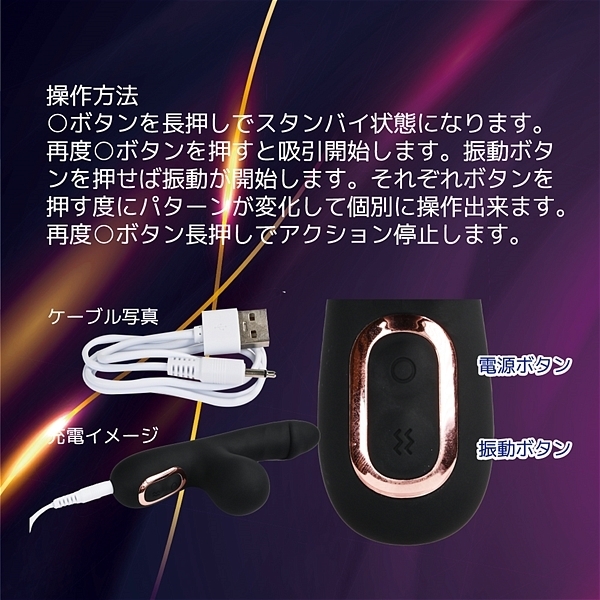 G責めと吸引外責めを楽しめる軽量・コンパクトなスティックアイテムです。 Gには絶妙な振動を生み出す上質のモーター。 何とも言えない快感の真空振動吸引機構を外責めに配置。 滑らかで肌心地の良いシリコン素材にしっかり洗えるIPX5の防水性能。 実用性の高い10パターン振動で自分に合わせて楽しめます。 60分充電で最大40分の使用が可能(使用環境により大幅に増減します。 )●HONEY ブラック |