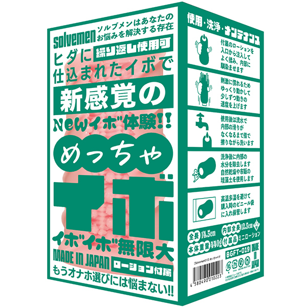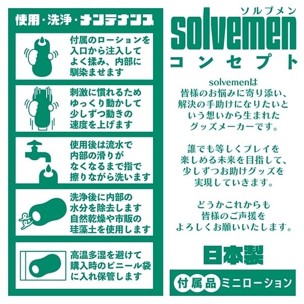 ソルブメンはあなたのお悩みを解決する存在です。 「今日はイボで刺激的に」「今日はヒダでやさしく」同じものを使い続けたいときもあれば、1日おきに違うものを使いたいときもある。 そんな気まぐれに全力で応えたいです。 それがソルブメンの生まれた意味だと思いませんか?今回のテーマは「めっちゃイボ」となります。 敢えてイボだけにしなかった意図をお教えしましょう。 ヒダのなかに確かな存在感、イボは本当にイボ。 それは間違いないのです。 しかし敢えてヒダの群れにイボを配置する事でしか生まれない、極上の快感ハーモニーがあることをどうしても感じて欲しかったのです。 あなたはオナホ選びに悩む必要はなくなります。 あなたのためにソルブメンがいるのです。 安心安全の日本製で繰り返し何度でも利用が可能です。 |