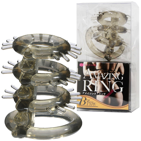 新しい刺激と快感に出会える!男根をしっかりと締め付け、持久力アップを強力にサポートする4連リング仕様の男性補助グッズ。 タイプBは上部3つのリングに付いたトゲが、くすぐるように刺激を与える特殊形状!さらに連結部分の波形状が相手の敏感なところを責め立てます。 また、リングを玉袋に通すか通さないかで体感する刺激が変化!いつもと違う快感と持続力で、貴方の日常を変えるペニスリングです。 |